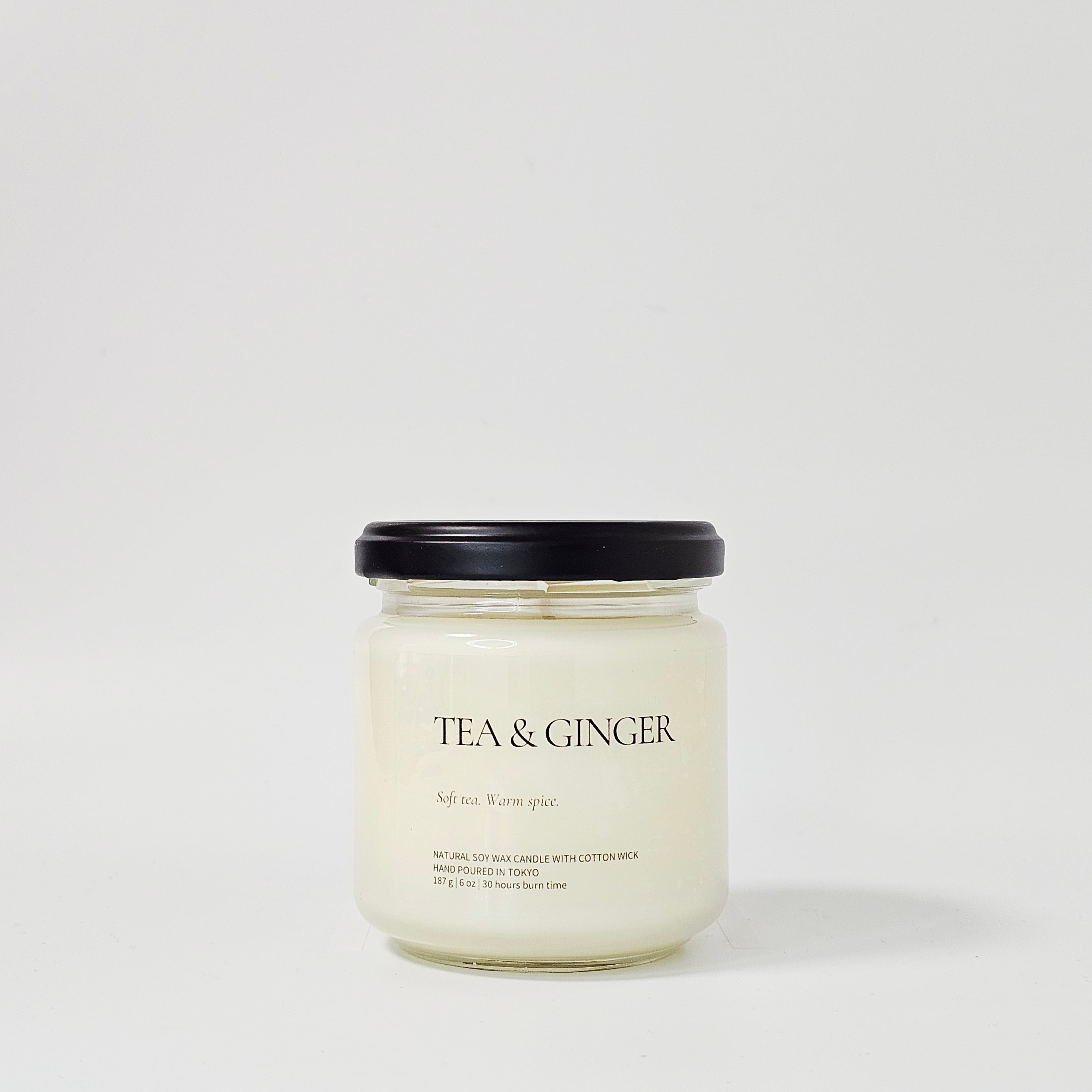 Tea & Ginger は、ホワイトティーの透明感とジンジャーの温かみを掛け合わせたソイキャンドルです。甘さを抑えたクリーンな香りは、集中・リセット・マインドフルネスの時間に最適。