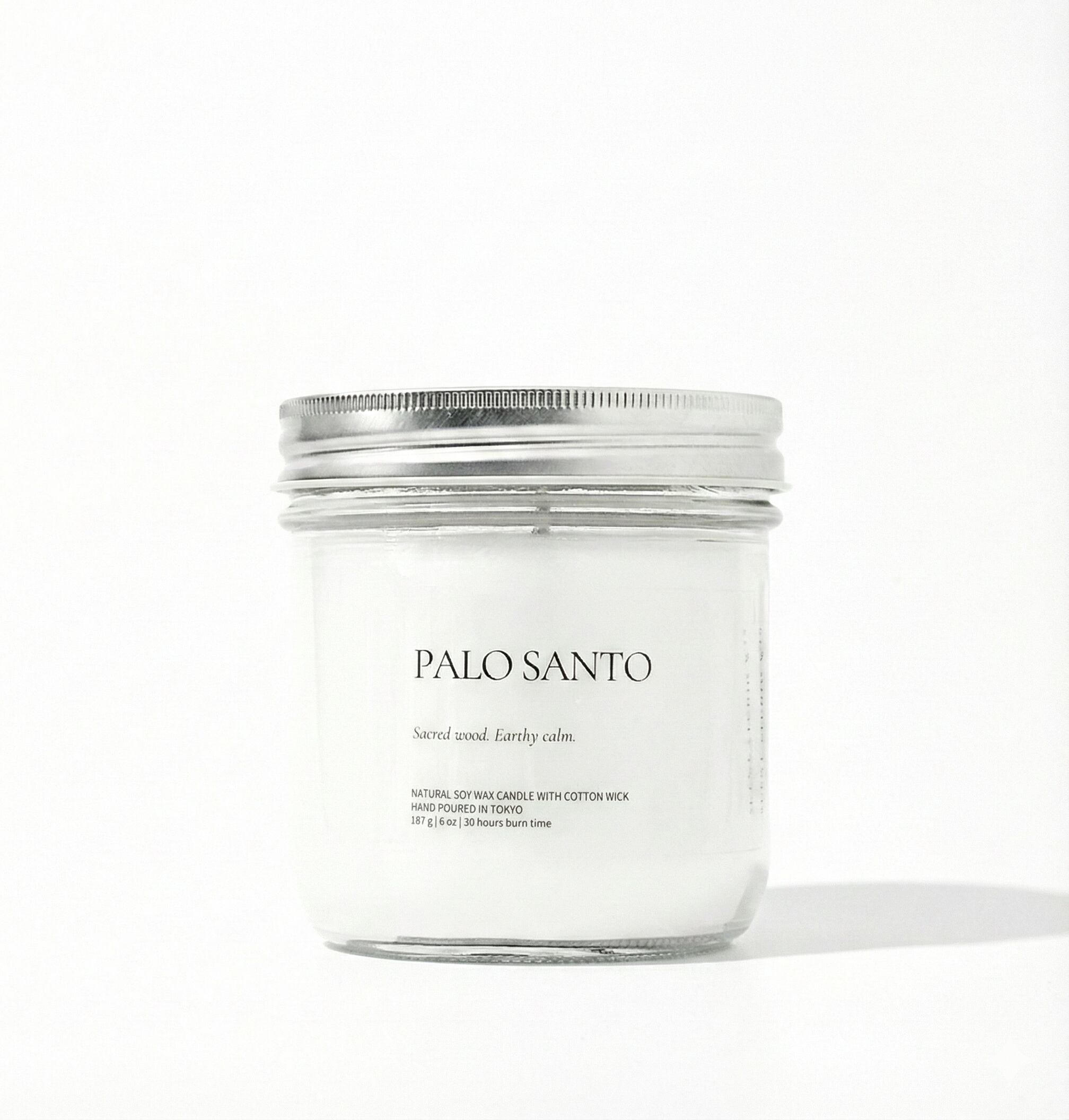 Palo Santo(パロサント)は、ブラックペッパーとラベンダー、ウッディノートが重なる、深くスパイシーなソイキャンドルです。空間の空気を切り替え、集中力を高めたい時に。
